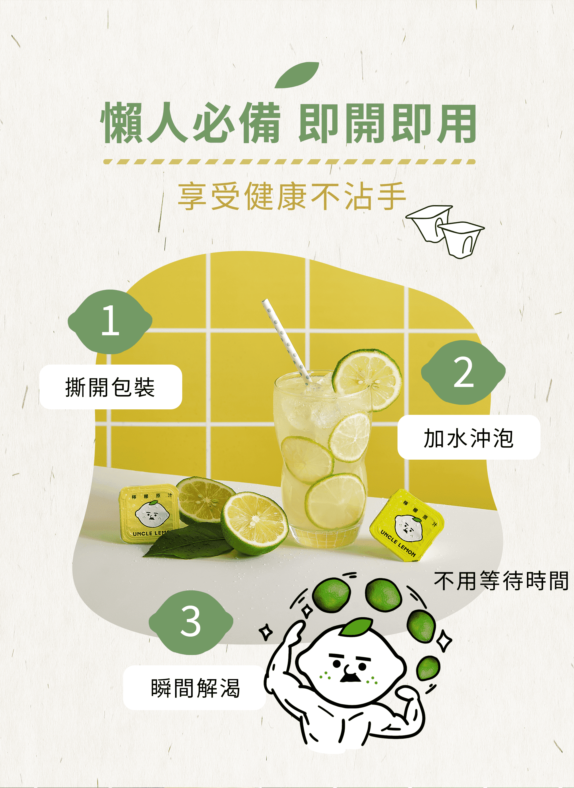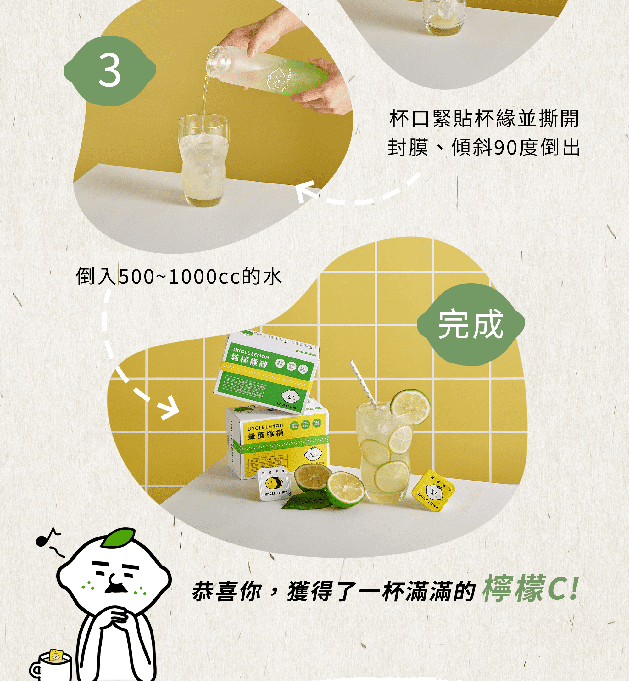 1.撕開封口,直接倒入杯中,加入600~1000cc開水、氣泡水、飲料即可直接飲用