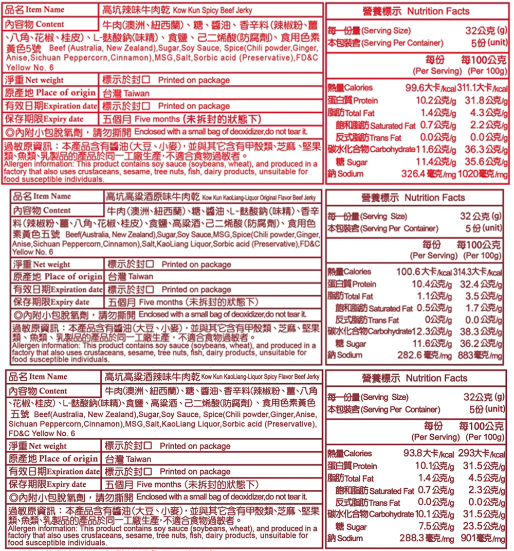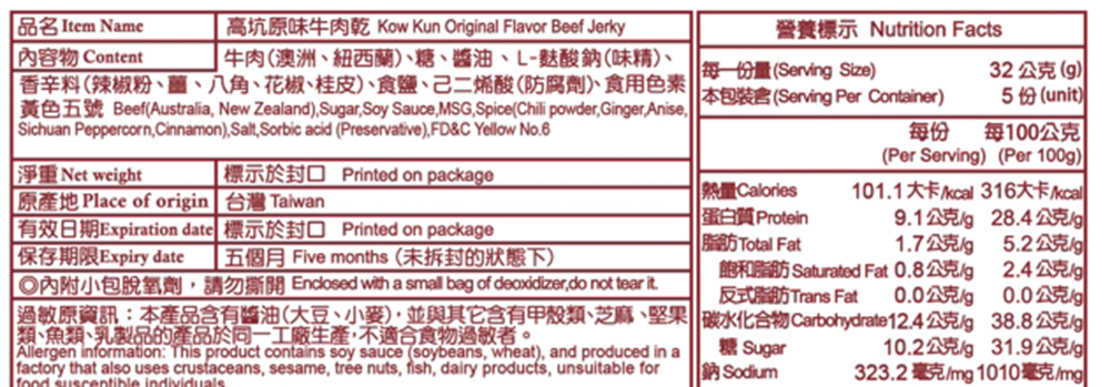 內容物成份:牛肉(澳洲、紐西蘭)、糖、醬油(大豆、小麥)、香辛料(辣椒粉、八角、花椒、桂皮)、食鹽、高粱酒