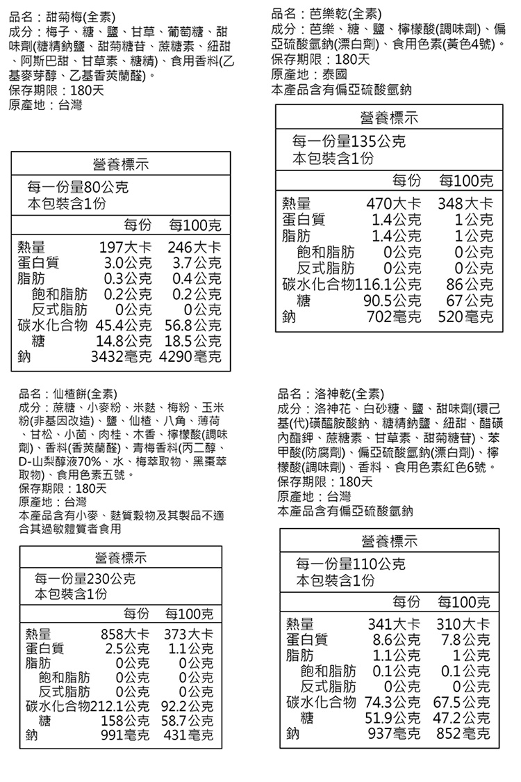 洛神乾: 洛神花、白砂糖、鹽、甜味劑(環己基(代)磺醯胺酸鈉、糖精鈉鹽、紐甜、醋磺內酯鉀、蔗糖素、甘草素、甜菊糖苷)、苯甲酸(防腐劑)、偏亞硫酸氫鈉(漂白劑)、檸檬酸(調味劑)、香料、食用色素紅色6號 過敏原:本產品含有偏亞硫酸氫鈉