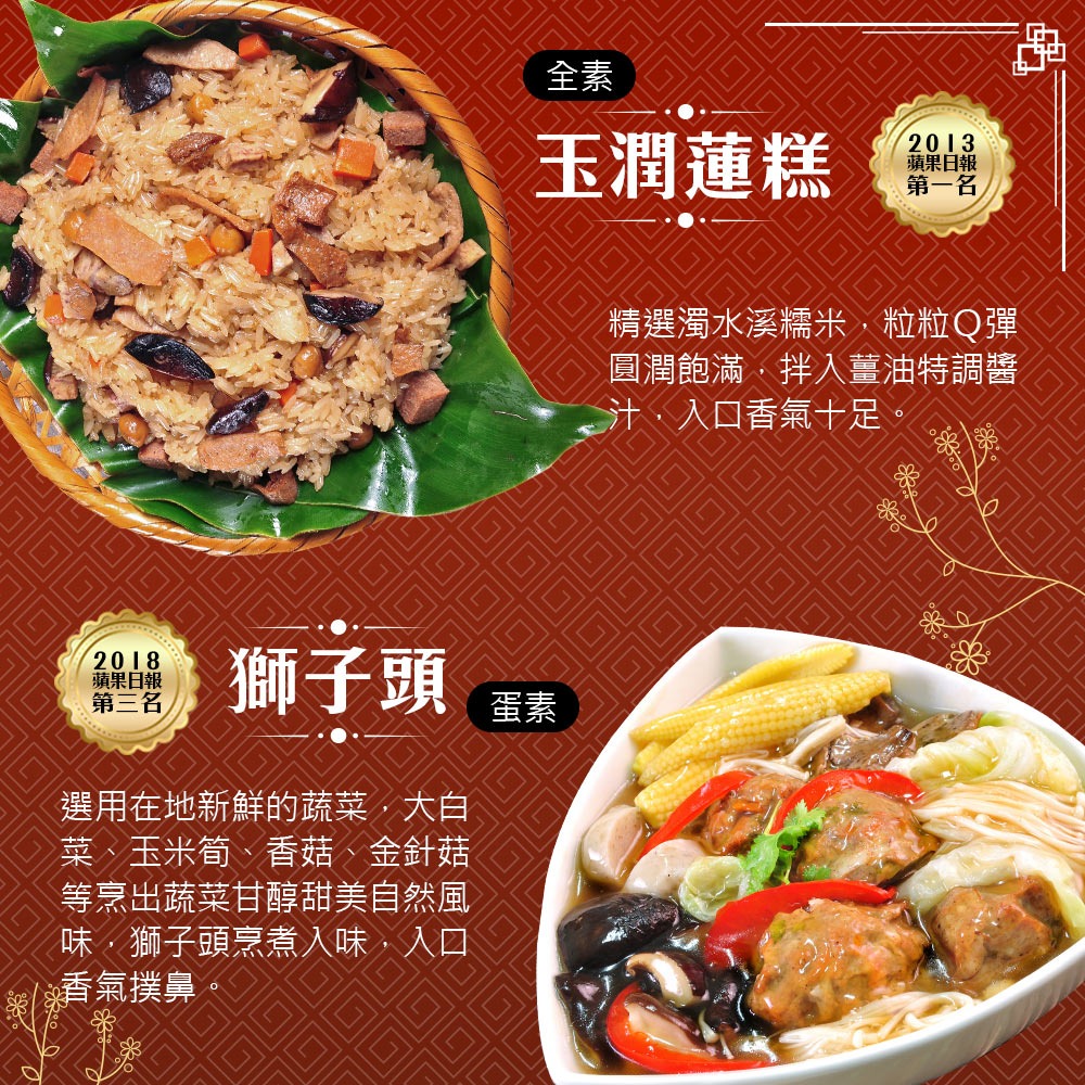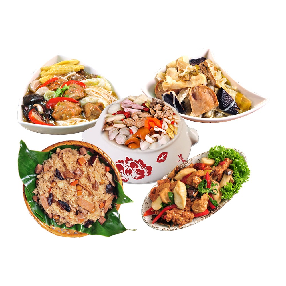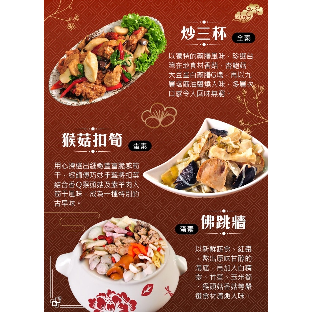 ◎規格:1組(炒三杯(全素)、玉潤蓮糕(全素)、佛跳牆(蛋素)、猴菇扣筍(蛋素)、獅子頭(蛋素))。