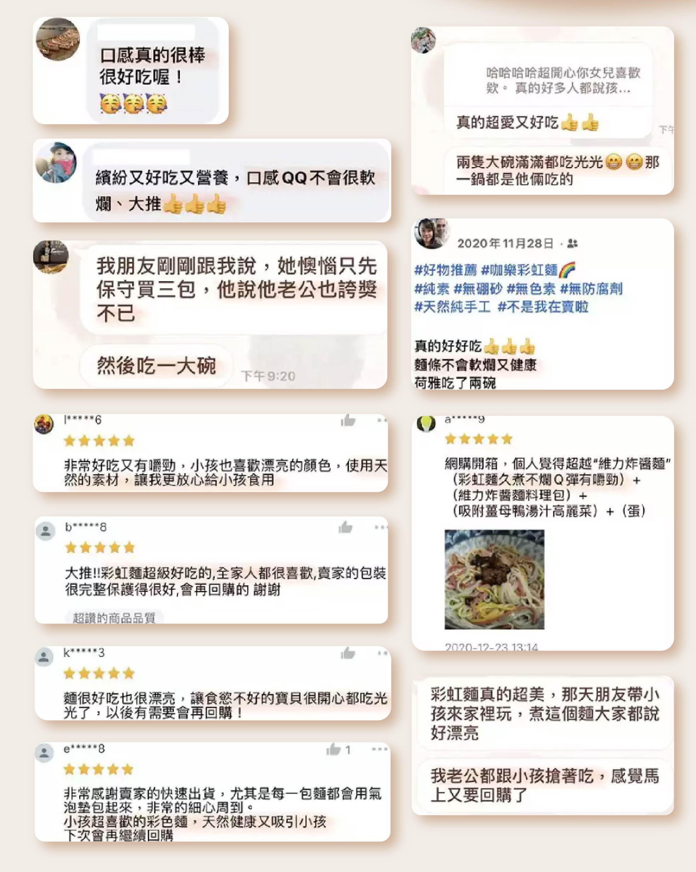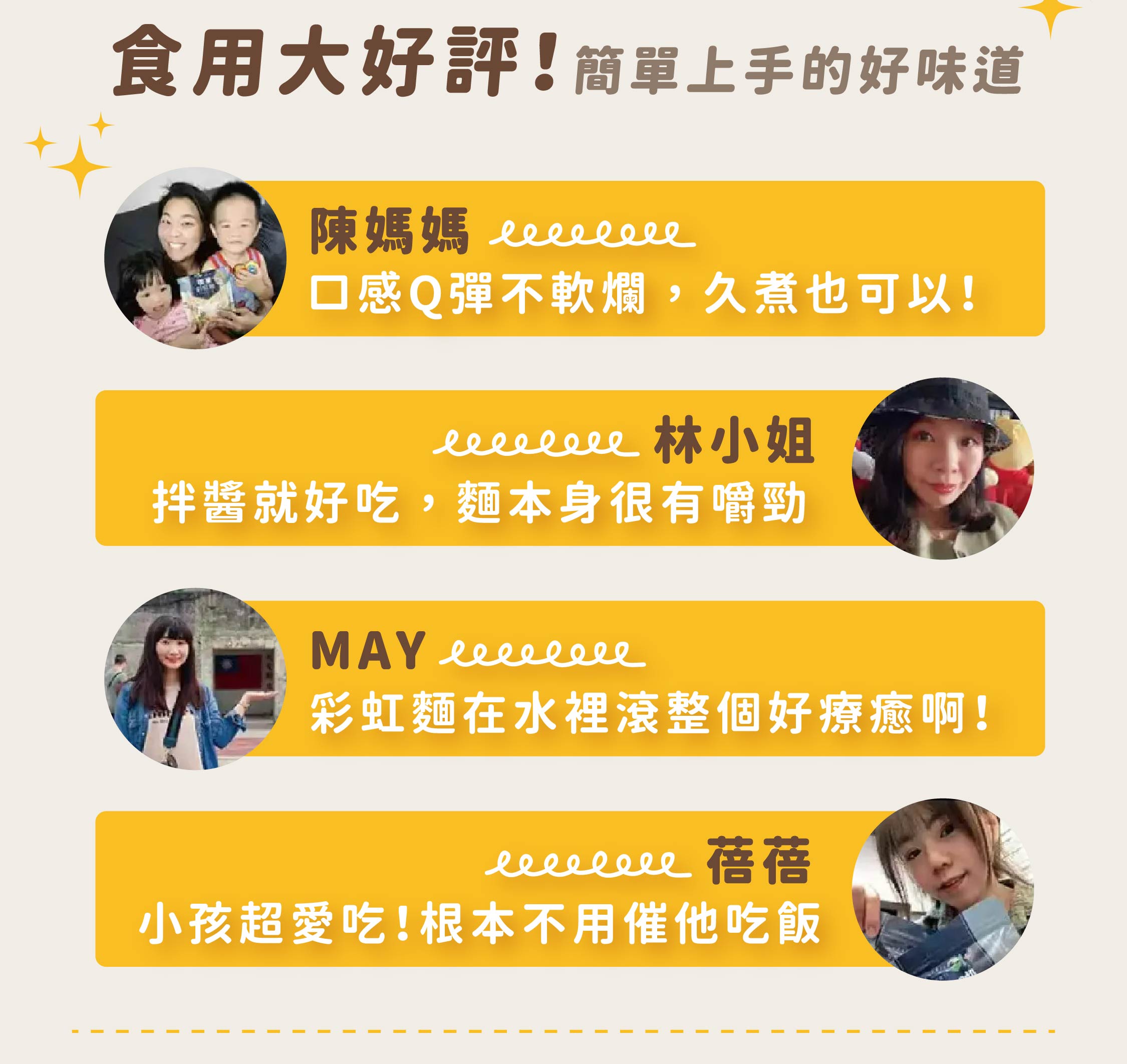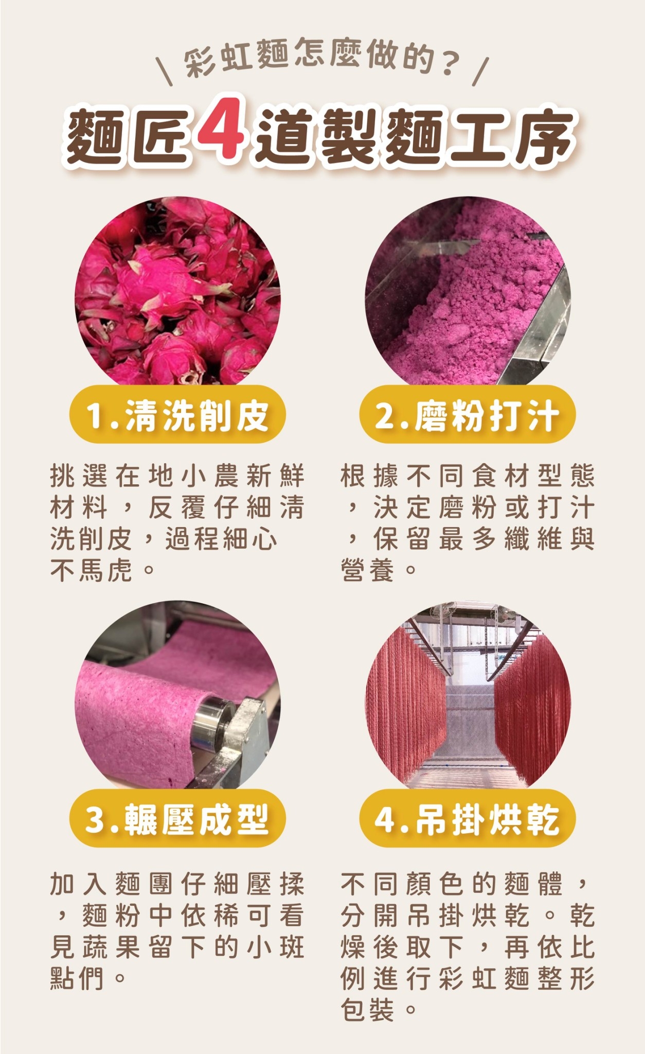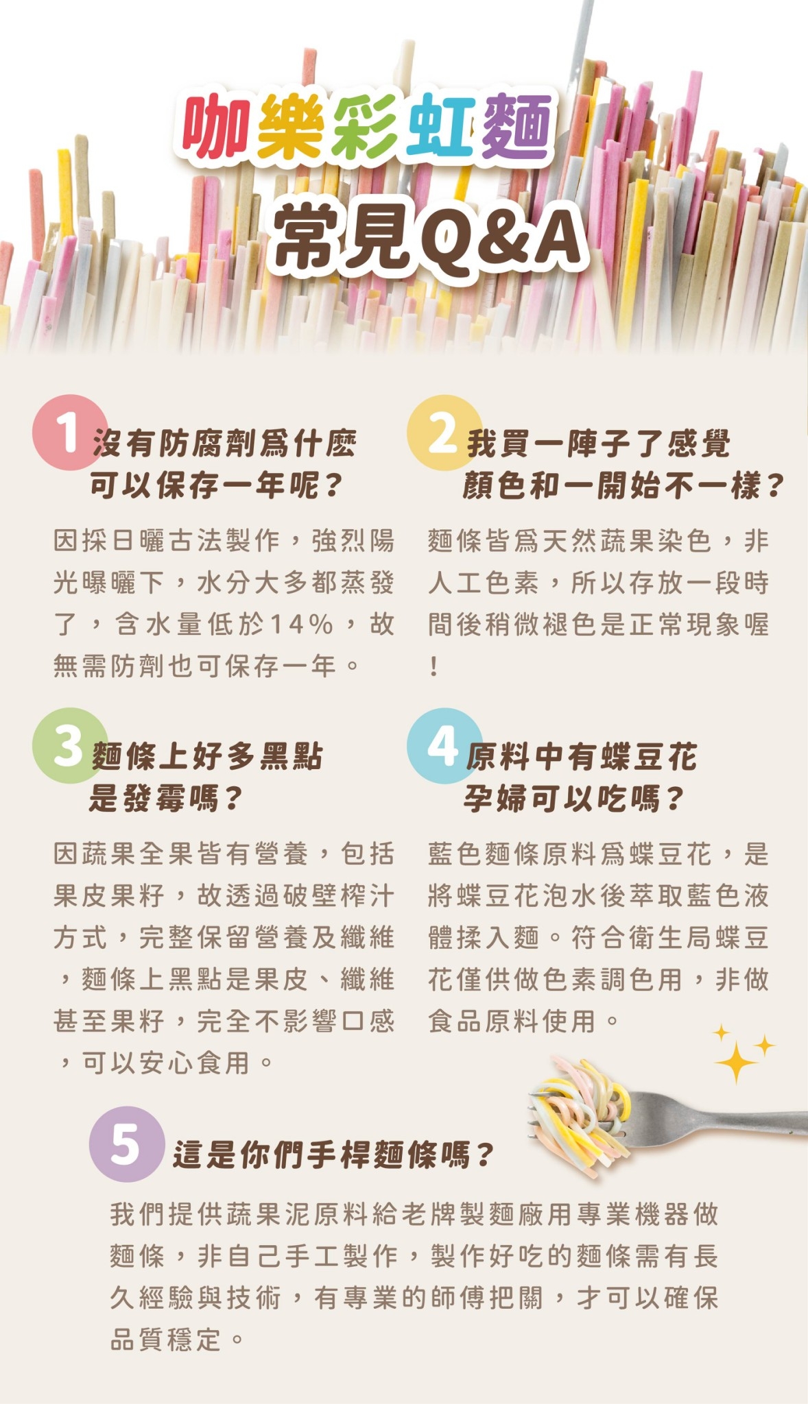 ◎小提醒: 麵條斑點為蔬果纖維、果皮或果籽的呈現,非發霉,請安心享用。天然蔬果添加,接觸陽光、光源可能產生褪色情形,此為正常現象 請安心食用。