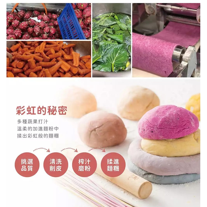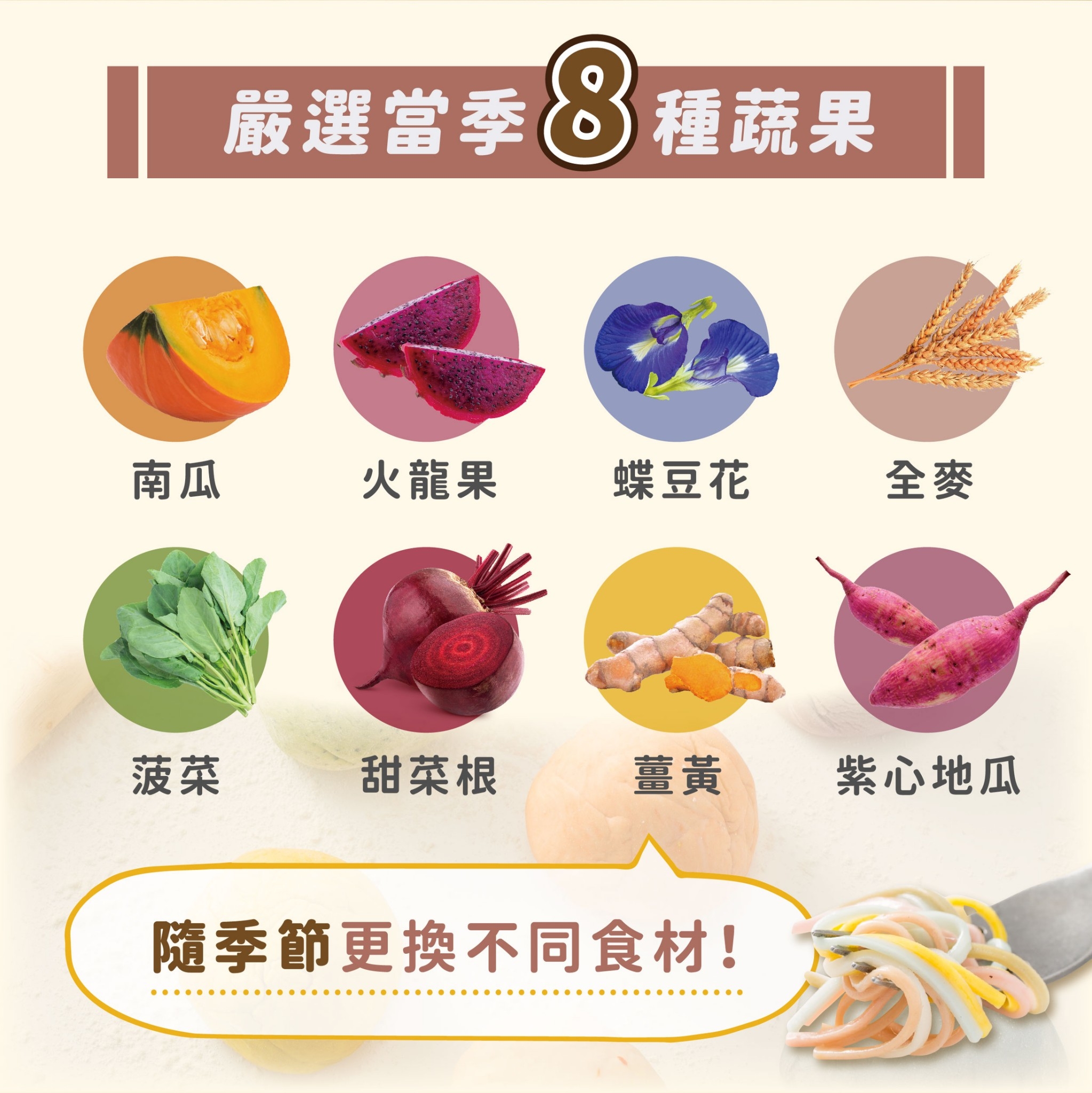 ◎成分:麵粉、RO水、蔬果泥、(依季節添加新鮮紫地瓜、黃地瓜、紅龍果、紅蘿蔔、南瓜、地瓜葉、波菜、牛番茄、黃金蕎麥、薑黃、紅麴、甜菜根、蝶豆花)、愛爾蘭有機海藻鈣。