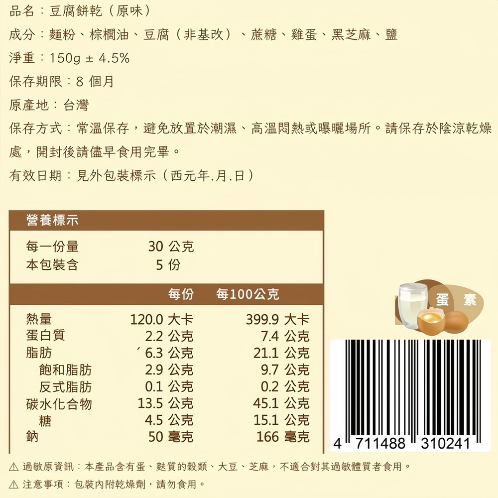 ◎過敏原:本產品含有蛋、麩質的穀類、大豆、芝麻,不適合其過敏體質者食用