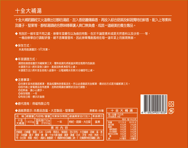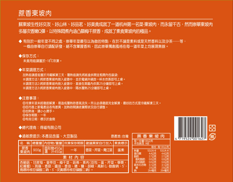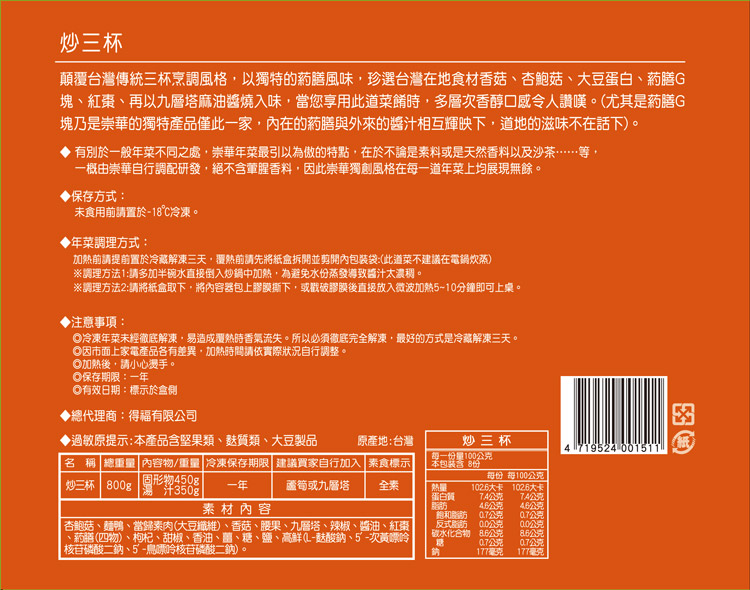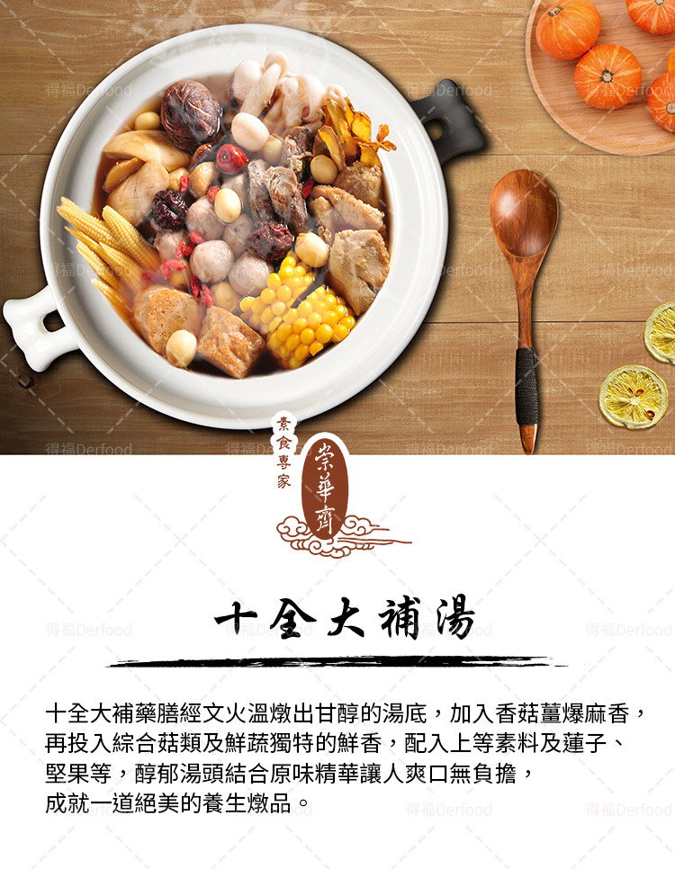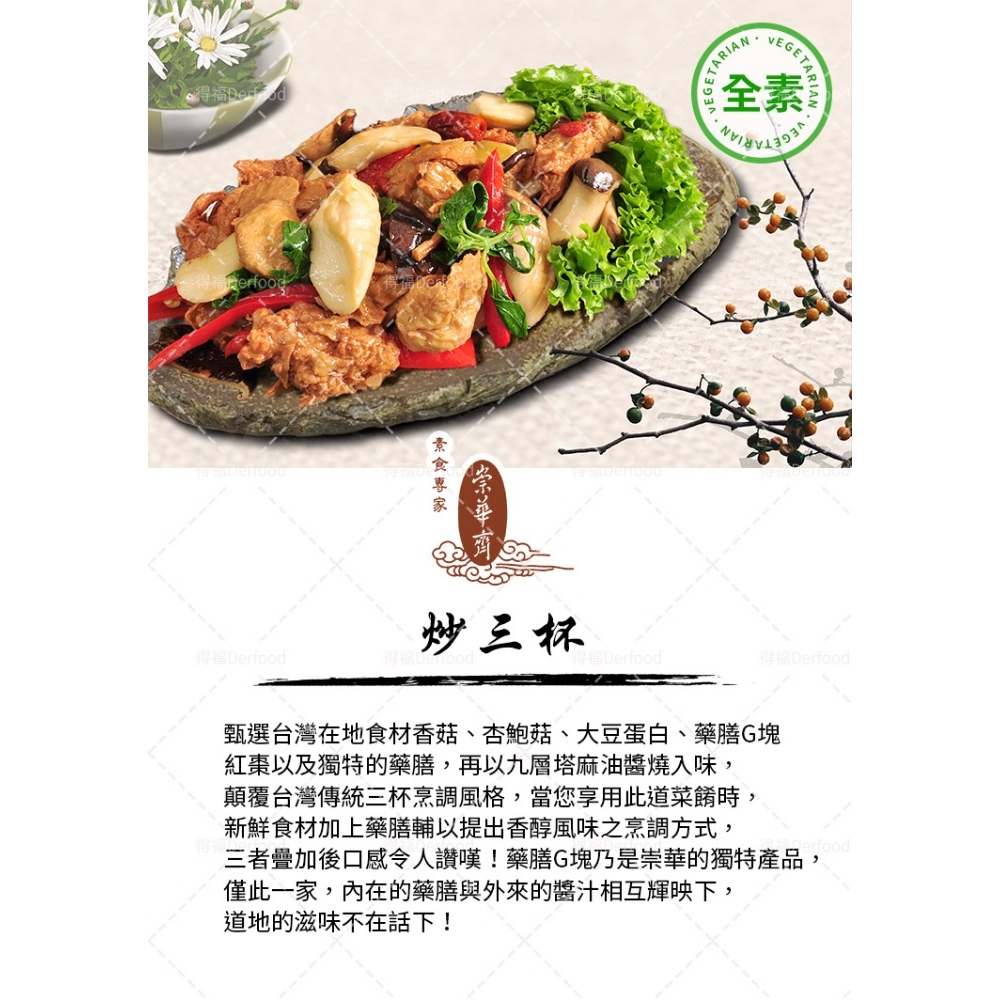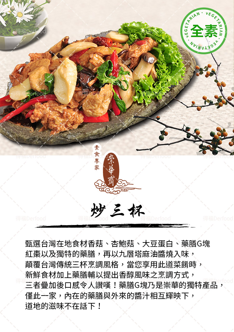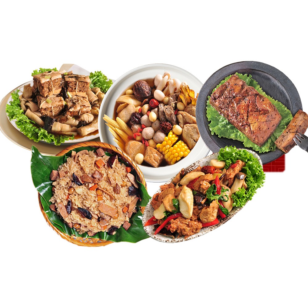 ◎規格:1組(炒三杯(全素)、玉潤蓮糕(全素)、十全大補(蛋奶素)、蔗香東坡肉(蛋奶素)、椒鹽素排(蛋奶素))。