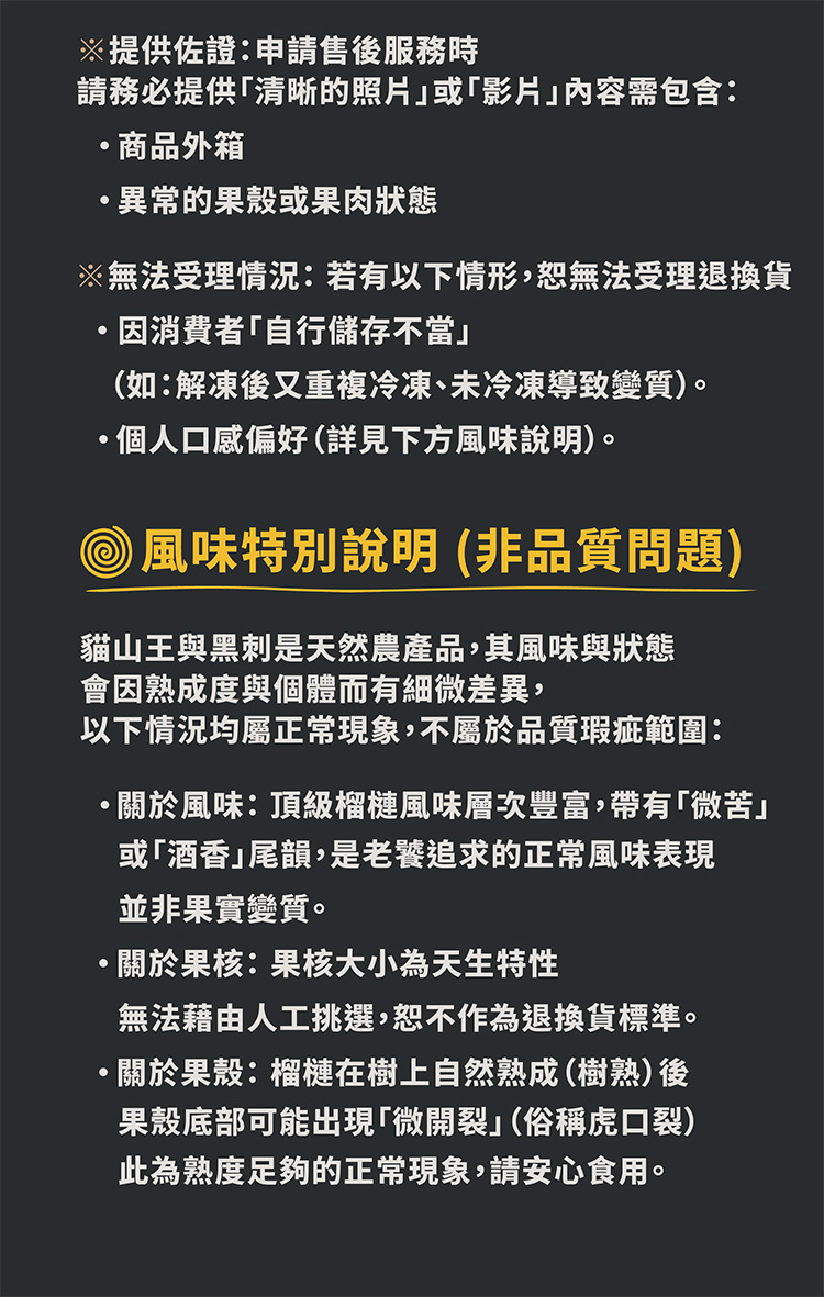 依據「通訊交易解除權合理例外情事適用準則」第2條第一項:「易於腐敗、保存期限較短或解約時即將逾期」之商品,屬於消費者保護法第19條第一項但書所稱合理例外情事。自105年1月1日起,生鮮食品不適用於消費者保護法第19條,並不享有7天鑑賞期,因肉品等冷凍食品或生鮮商品屬消耗性商品,商品屬性特殊或有保存期限等問題,除商品本身瑕疵或運送過程而造成的損毀,才可接受您的退貨申請。非商品瑕疵恕無法為您辦理退換貨,下單前請務必考慮、詢問清楚!一經拆封、食用、失溫及保存不良等情形而導致商品變質,則無法處理您的退換貨申請,敬請見諒!