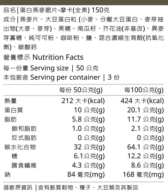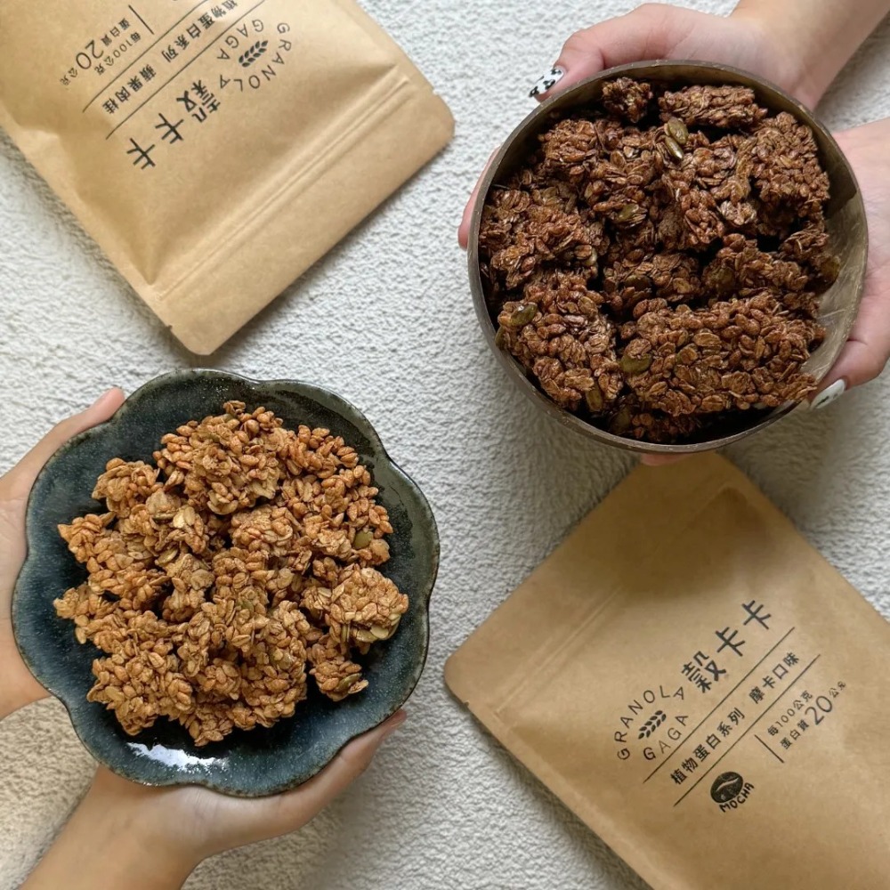 沉浸在香濃咖啡與濃郁可可的雙重享受中,這款摩卡風味燕麥脆片採用精選大豆蛋白粒,每100克含有20克高蛋白,滿足健身愛好者與健康飲食追求者的需求。不僅營養滿分,還擁有手工製作的酥脆口感,完美搭配你的早餐、下午茶,或是運動後的優質蛋白點心。