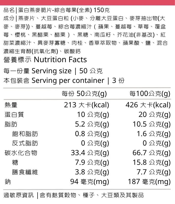 綜合莓果蛋白燕麥脆片,添加蔓越莓乾與天然莓果風味來源,果香自然迷人,酸甜爽口、不膩口。酥脆口感來自嚴選的大豆蛋白粒與南瓜籽,每一口都吃得到營養與滿足。