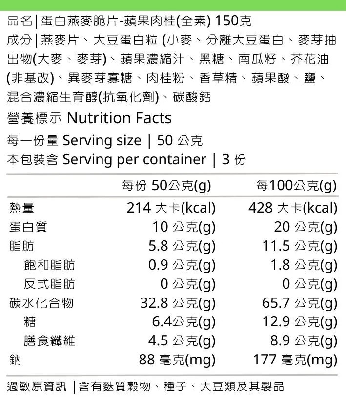 *過敏原資訊 : 含有麩質穀物、種子、大豆類及其製品。