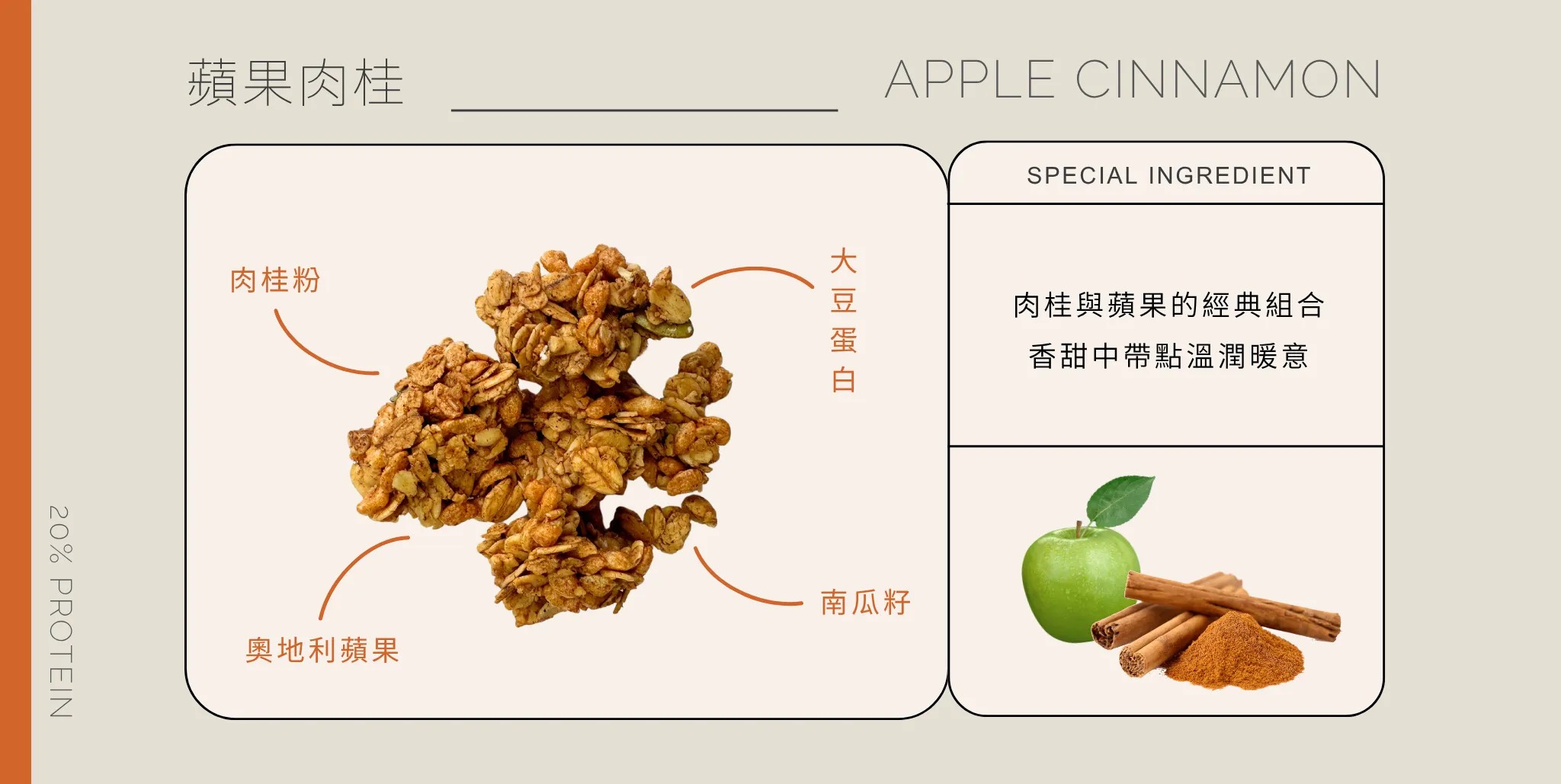 蘋果與肉桂的完美融合,帶來溫馨又滿足的口感。加入大豆蛋白粒,每100克提供高達20克蛋白質,不僅不甜膩還更健康。無論是與植物奶搭配,還是直接作為零食,都能感受到滿滿的幸福感。
