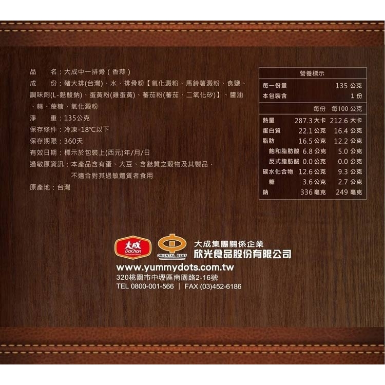 ◎品名:【大成食品】中一排骨 (135g/片)(單片裝) 香蒜排骨
