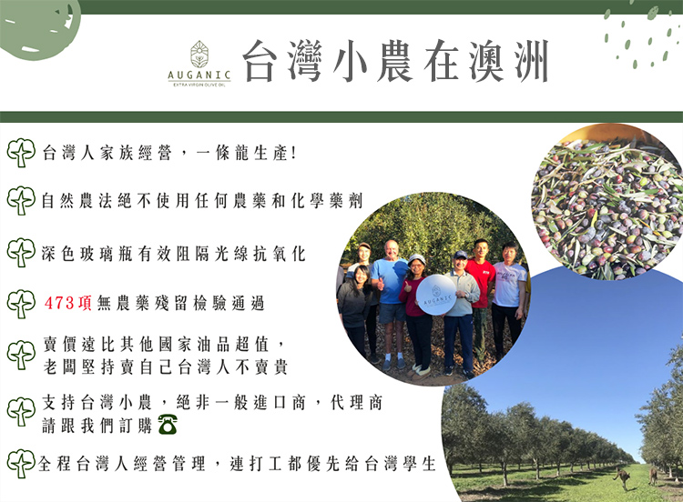 台灣小農在澳洲,把澳洲橄欖原味帶回到台灣,橄欖油的最後良心、純淨、天然、AUGANIC澳根尼 !