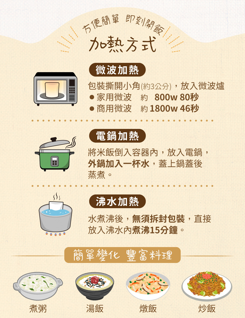 1.微波加熱:包裝撕開小角 800w 80秒