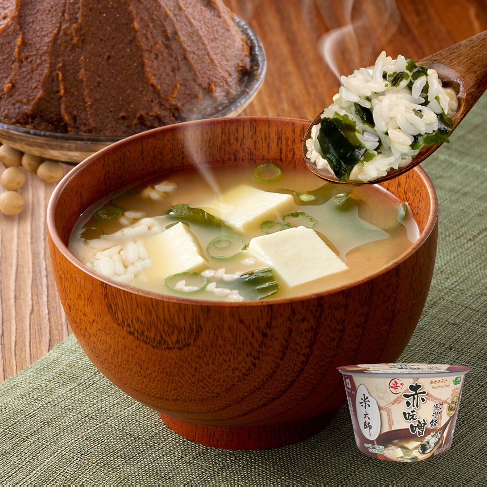 ◎品名:【米大師】湯泡飯-赤味噌(210g/碗)(純素)另附辣油 微辣不嗆口 沖泡 常溫 沖泡粥 泡麵 日本傳統釀造赤味噌 豆腐