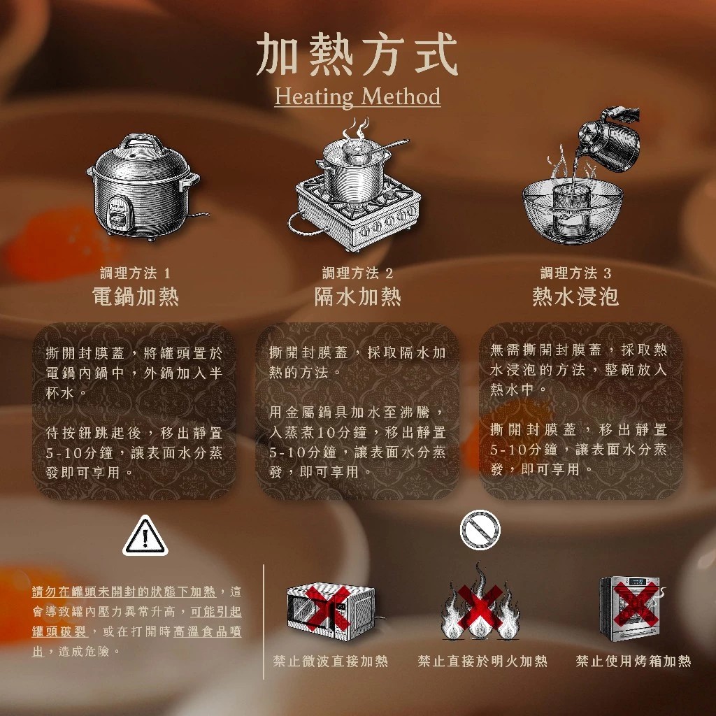 建議在開啟封膜蓋的情況下,將罐頭放置於電鍋內鍋中,外鍋加入半杯水。待按鈕跳起後,開蓋靜置5-10分鐘,讓表面水分蒸發,使其Q彈,即可享用。