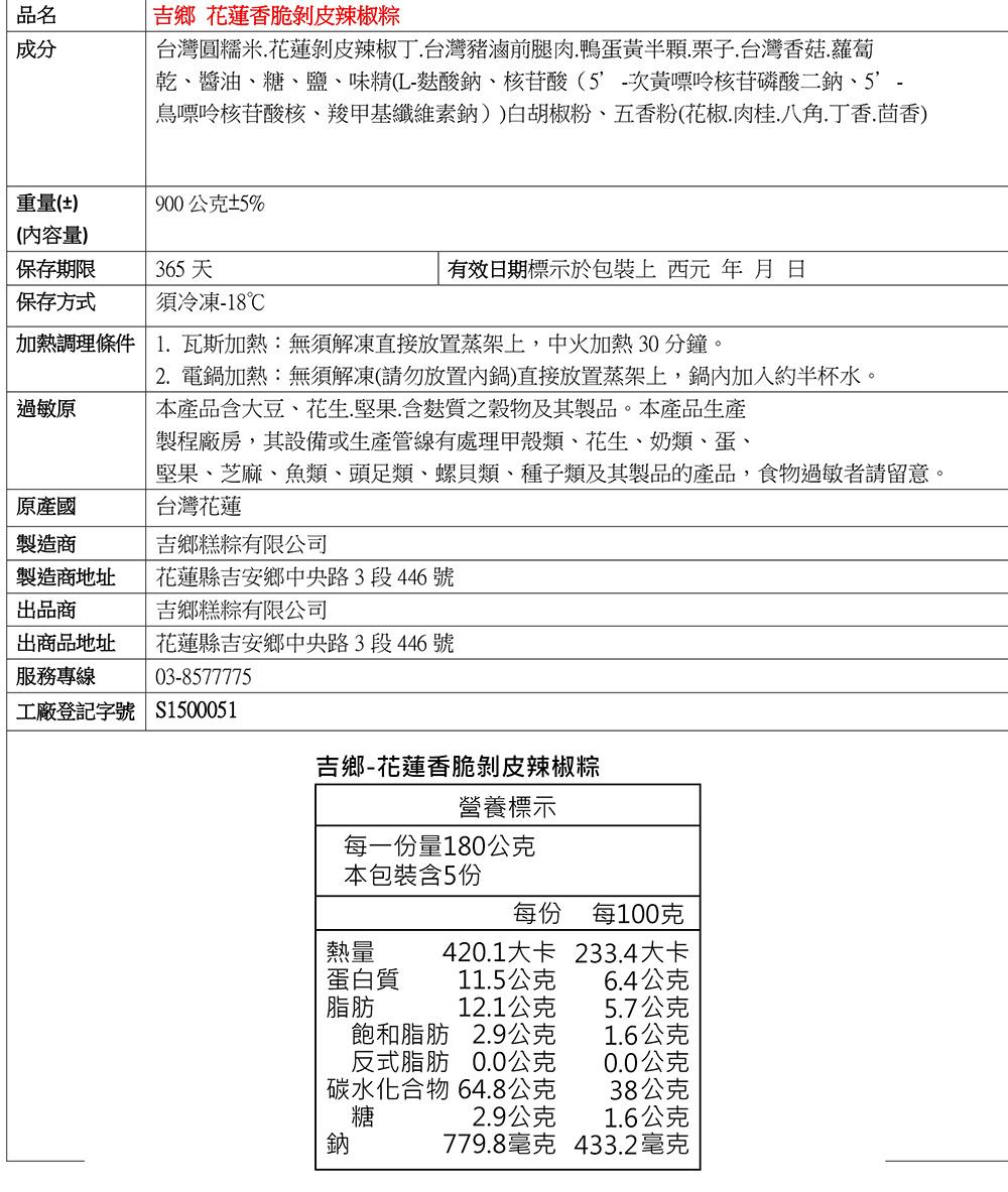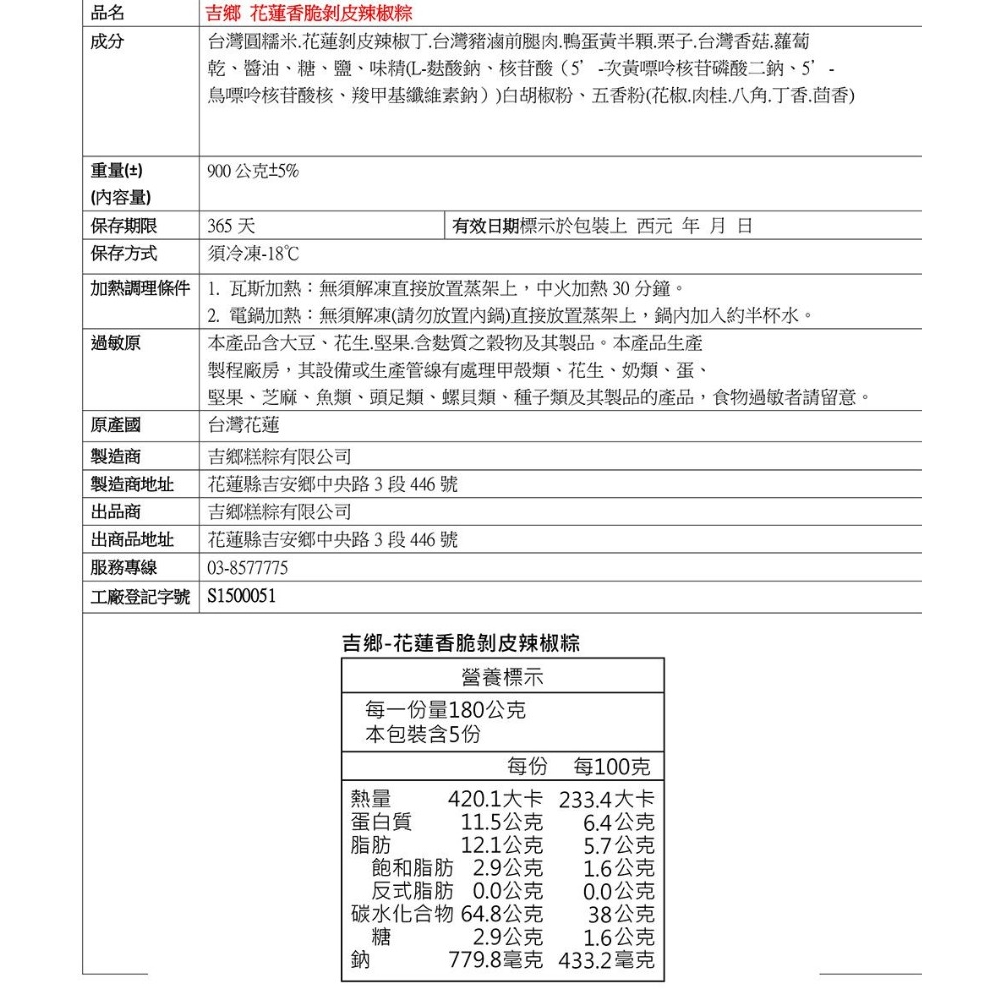 ◎品名:【吉鄉】花蓮香脆剝皮辣椒粽 5粒(180g±5%/粒)剝皮辣椒 鴨蛋黃 前腿肉 肉粽 小辣 香脆 圓糯米