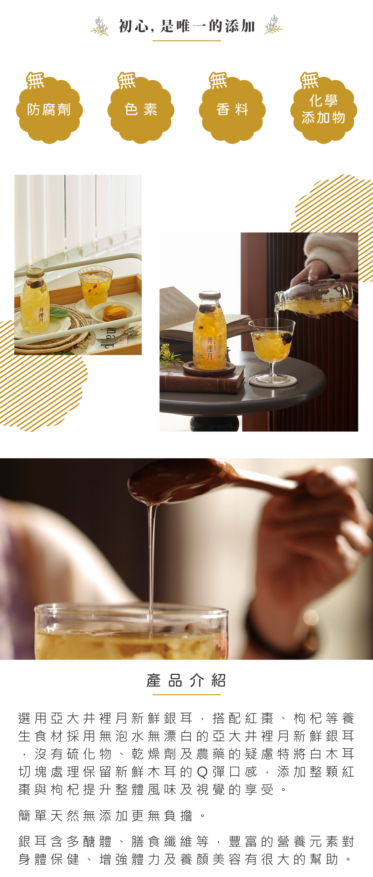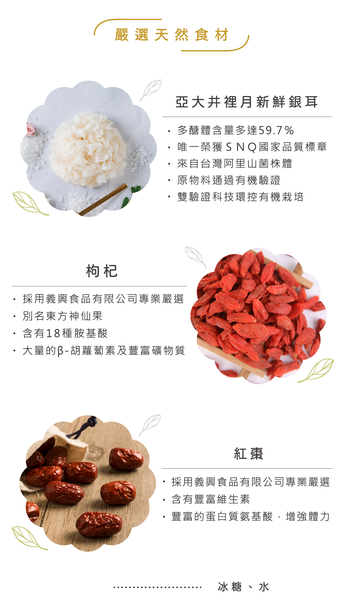 選用亞大T8新鮮銀耳,搭配紅棗、枸杞等養生食材。銀耳切塊處理不打碎,保留其新鮮Q彈口感,增加整體風味及視覺的體驗享受。