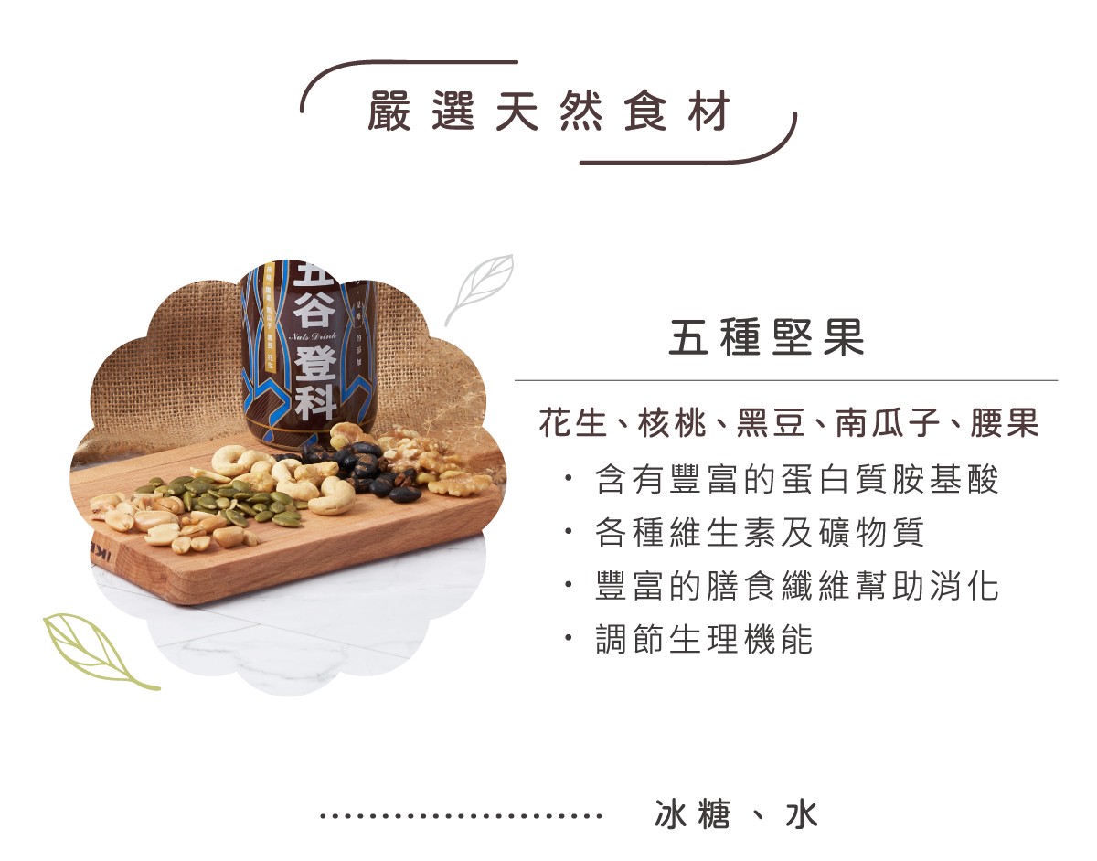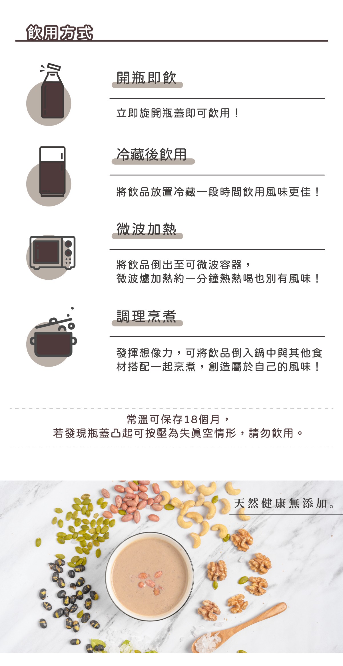 完美調和核桃、腰果、南瓜子、黑豆及花生,低溫烘焙濃醇且保留部份顆粒,能完整感受每個堅果在舌尖散發出來的香氣,無添加人工香料,可滿足一天營養所需,充滿活力。