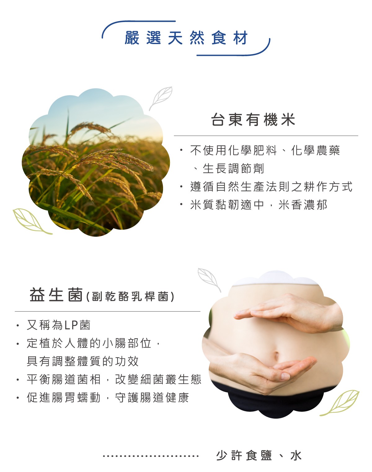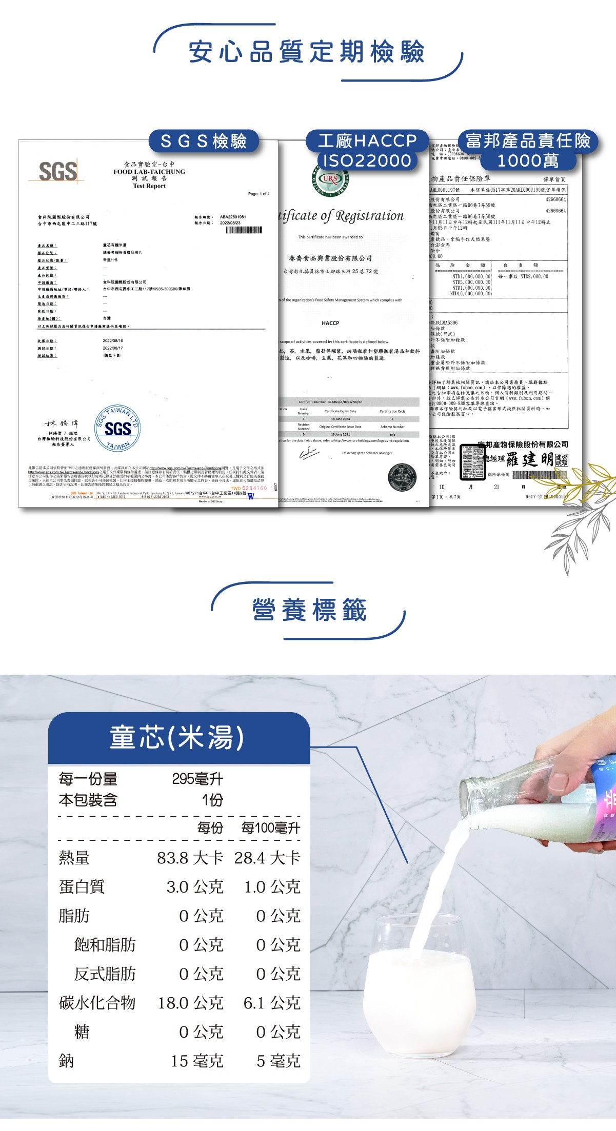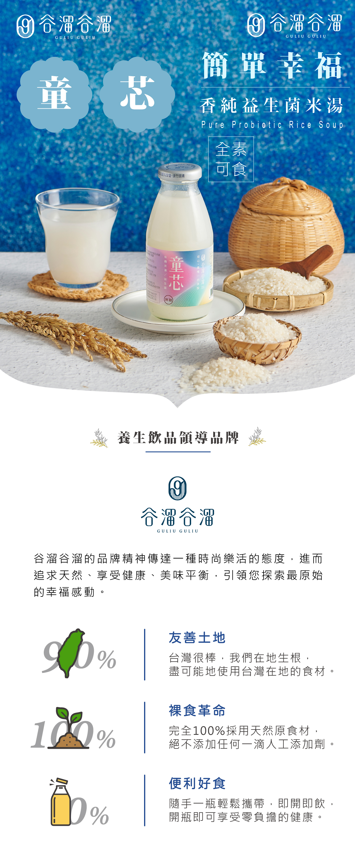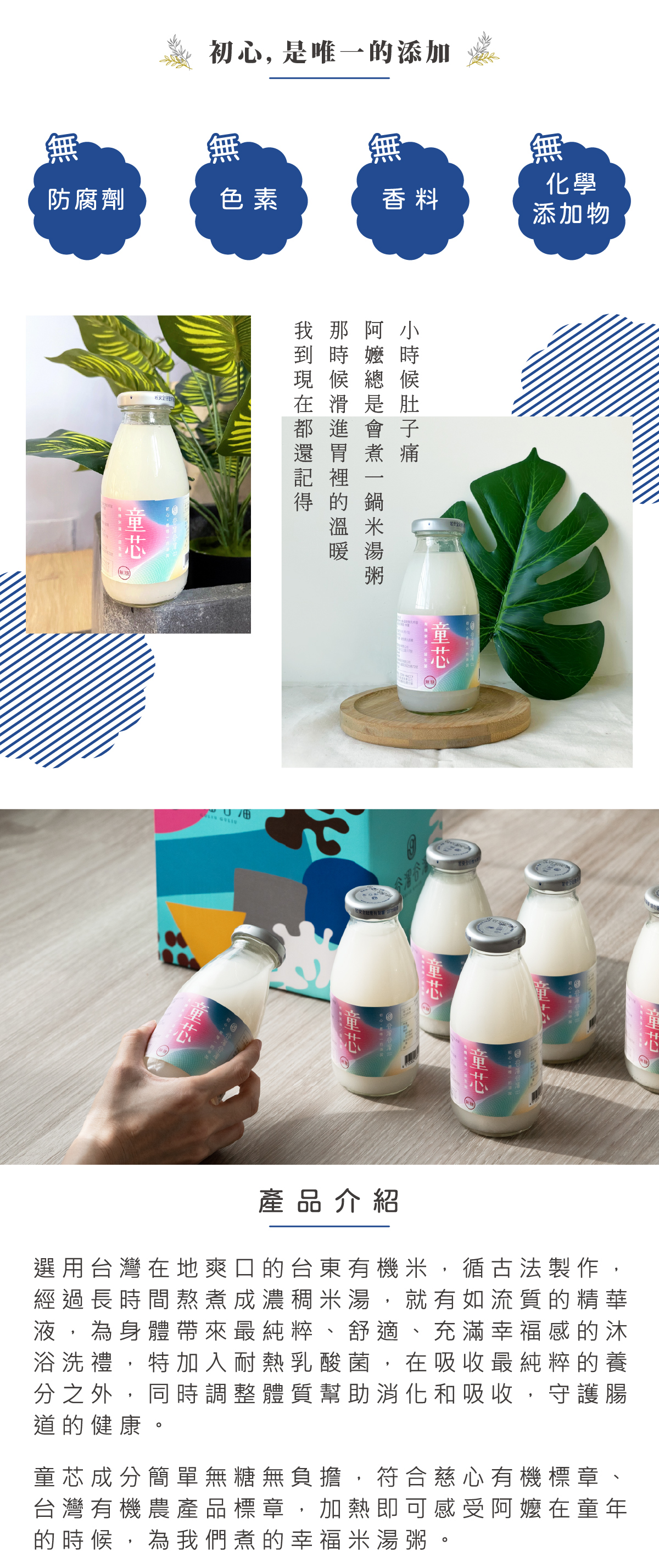 通過有機農產品及慈心有機雙認證,選用台灣在地爽口的台東有機米,循古法製作,經過長時間熬煮成濃稠米湯,特加入耐熱乳酸菌,在吸收最純粹的養分之外,同時調整體質幫助消化和吸收。