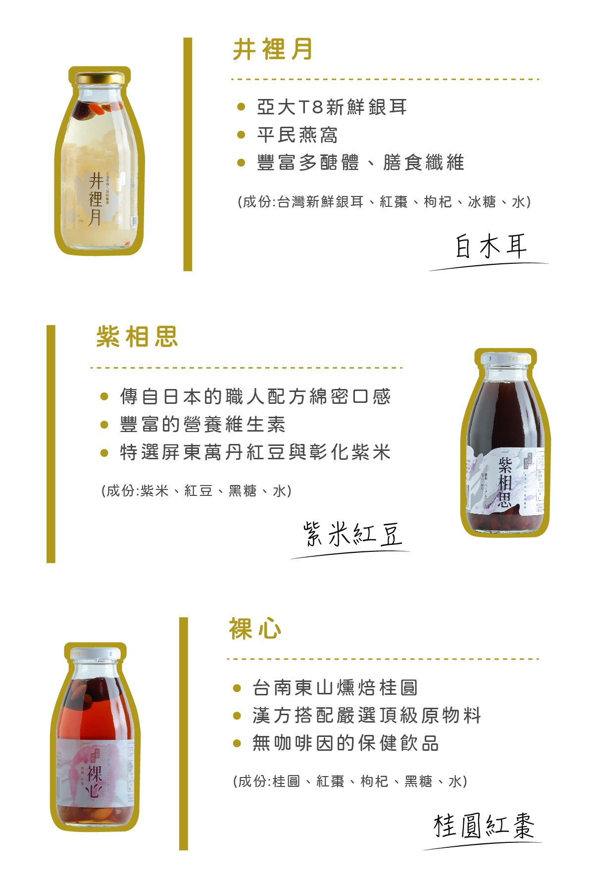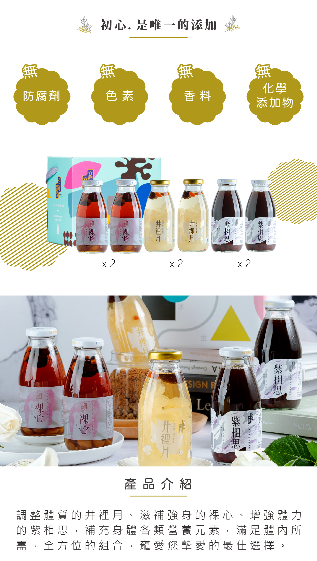 調整體質的井裡月、滋補強身的裸心、增強體力的紫相思,補充身體各類營養元素,滿足體內所需,全方位的組合,寵愛您摯愛的最佳選擇。